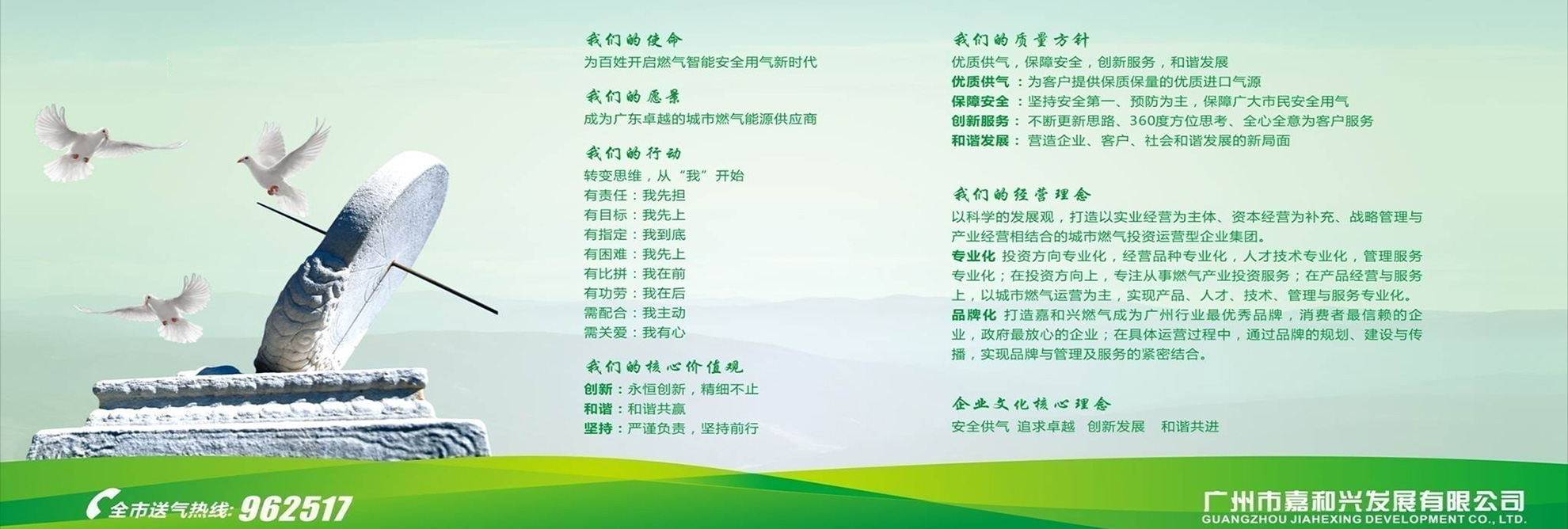 廣州市嘉和興發展有限公司于2001年3月1日注冊成立,主要從事瓶裝液化石油氣(LPG)批發貿易,民用、工業用液化石油氣,工業用氣體,汽車加氣站及危險品物流運輸等,總部設在廣州。目前公司經營三個液化氣充裝站、一個汽車加氣站:白云區神山達嶺液化石油氣站、白云區加禾氣站和佛山市南海區冠順氣站,黃埔區塘口汽車加氣站,總庫容接近800立方米。